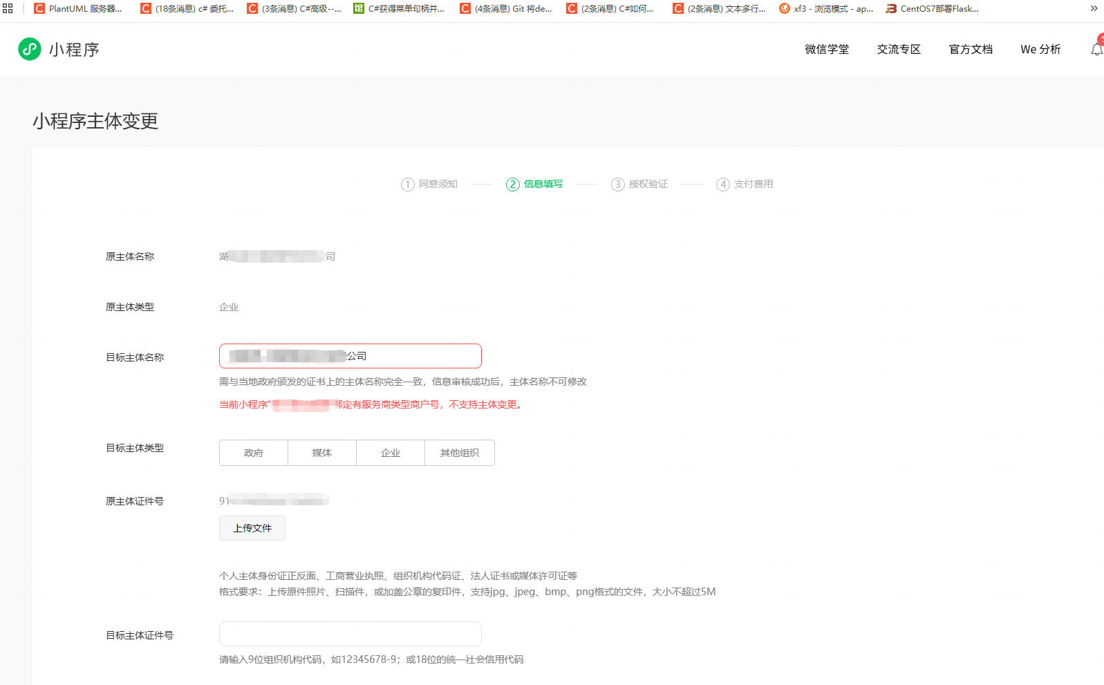 变更主体提示报错:当前小程序“捷xxxx”绑定有服务商类型商户号,不支持主体变更。
