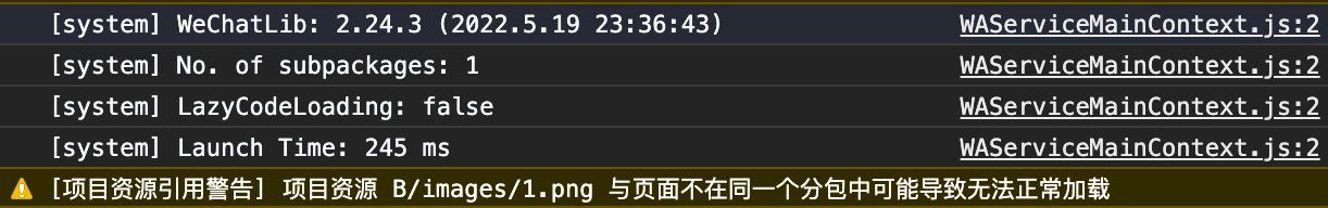 此时 A 中的页面引用 B 中的 component , component 使用了 B 包中的图片资源 1.png,此时开发者工具报警告(真机使用正常)