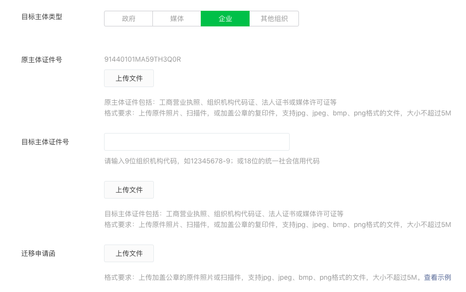 4、目标主体不支持与小程序原主体一致。