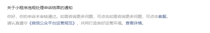 经核实,小程序存在无实质功能混淆搜索行为,请自觉遵守国家相关法律法规,不从事违法或违反《微信小程序平台运营规范》及相关规则的行为,暂不支持解封,谢谢。