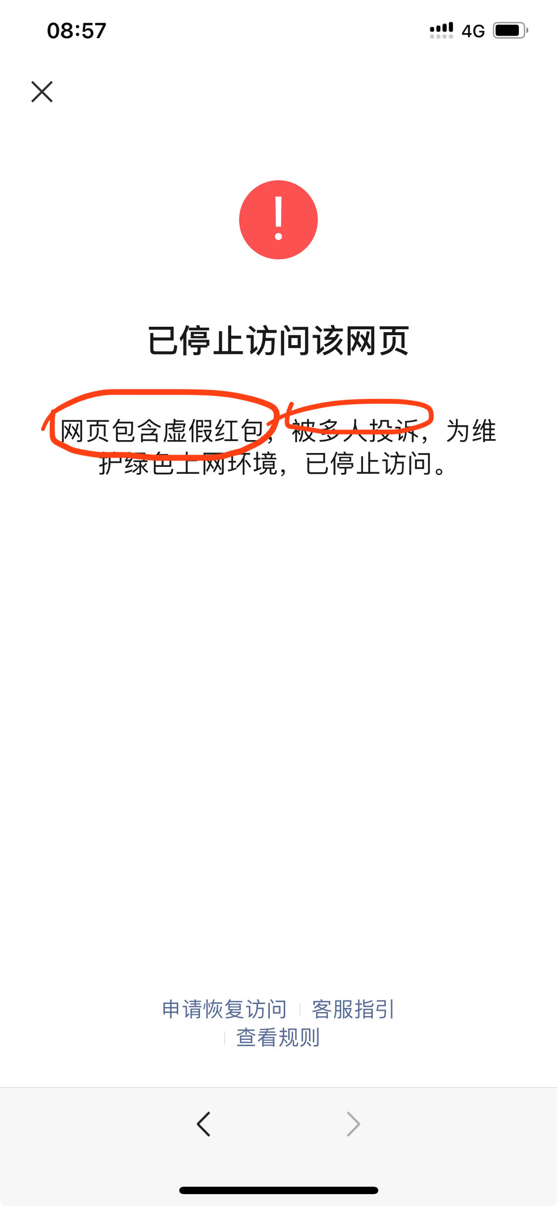 我单位为长城新媒体集团有限公司,是河北省委宣传部直管的文化企业,负责建设运营“冀云”新闻客户端, 近期我们客户端分享到微信群的稿件中经常出现“已停止访问该网页”的情况。 原因标注为“网页包含虚假红包,被多人投诉,为维护绿色上网环境,已停止访问”。 经我方反复核实,这些稿件内容未包含任何红包相关内容。 且有些为宣传省委政府重点工作的稿件,被屏蔽可能在微信平台中产生严重的负面影响甚至舆情。