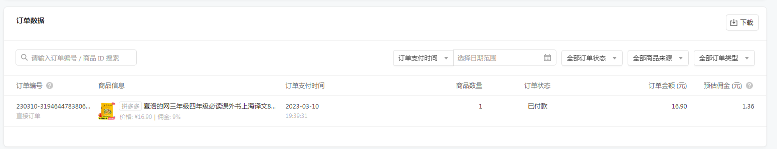 我公众号推送的流量主返佣产品有个订单,已经付款成功一周了就是不发货,由于商品显示失效我也没办法联系商家。只能看到是拼多多的商家。