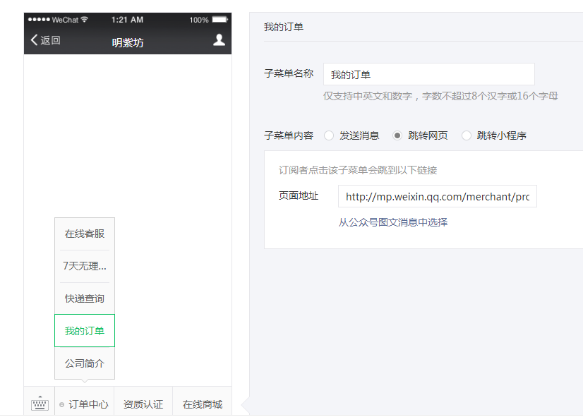 大家好。有谁知道。在微信公众号菜单栏设置:1.在线客服 2.订单详情。希望有个详细的操作流程,非常感谢了