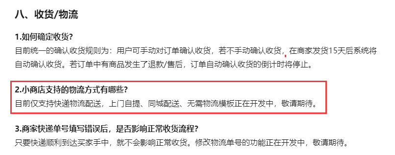 你好,目前仅支持快递物流配送,上门自提、同城配送、无需物流模板正在开发中,敬请期待。