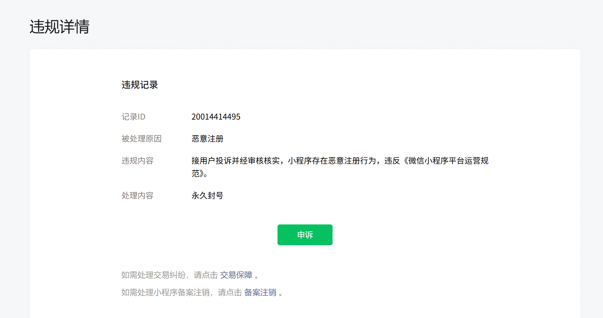 相同情况呀!申诉反馈根本看不到!怎么办?APPID:wx6d9ce974ce7a081b