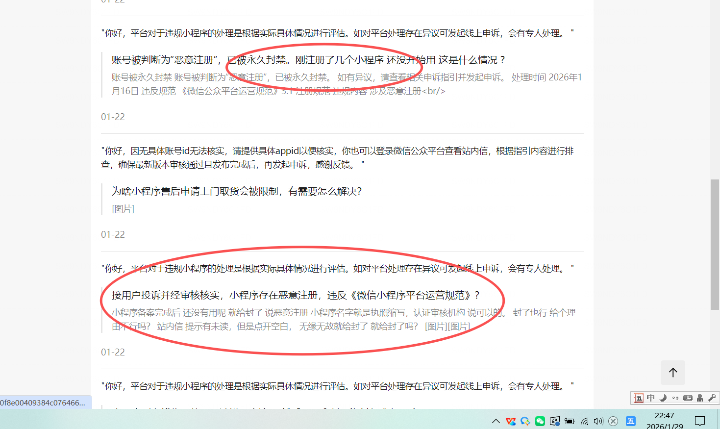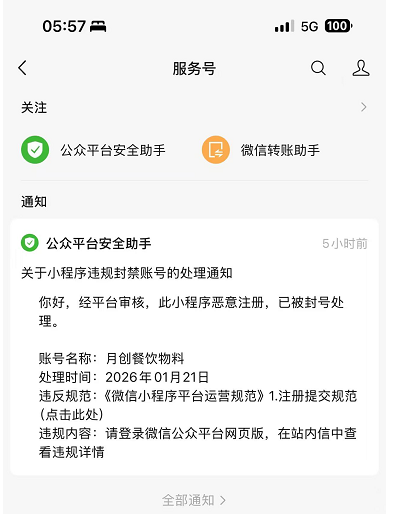 2026-01-20注册并花30元认证成功的小程序,2026-01-21收到提示:经平台审核,此小程序恶意注册,已被封号处理。还没用户使用,就说恶意注册永久封号。