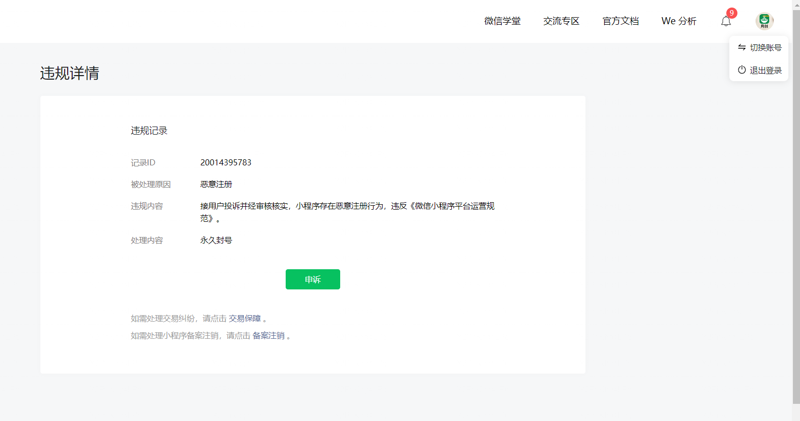 关键是 被封号的小程序通知中心打开显示空白,重新登录还是显示空白,也没有线上申诉的入口,也联系不上人工克服。,发起线上申诉的入口都没有。都2026年了连个申诉入口都没有 。