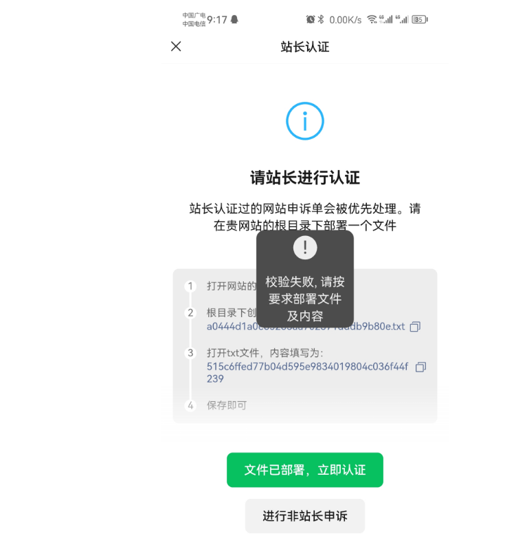 封禁后,文件已经部署在主域名下面了 ,就一直提示 校验失败 。