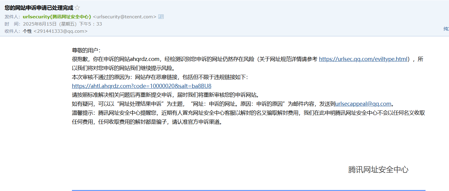 域名被微信拦截,域名是用来跳转微信小程序的,旗下子域名全部被拦截,网站均无违规,根本找不到相关客服人员,邮件申诉了好几次,每次都是回复一样的答案,怀疑是AI回复的,毕竟社区也是AI在回复问题,现在公司业务没法使用,问题也解决不了,小程序无法使用,发帖和发邮件至urlsecappeal@qq.com也是石沉大海