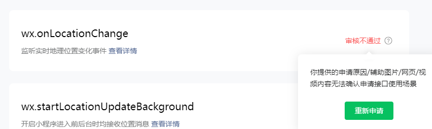 你好,核实到小程序申请wx.onlocationChange接口审核不通过,根据提交的申请信息可知申请该接口是用于【提供景区导航导览服务】,但小程序内未含有需在小程序内监听用户实时运动轨迹的使用场景,建议上传小程序申请接口相关使用场景的完整录屏(含小程序昵称)重新提交审核。