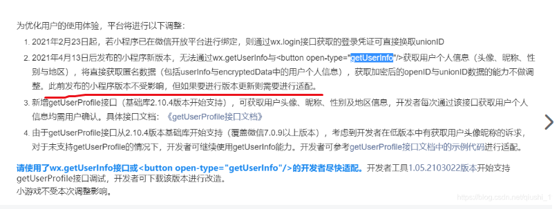 周知:getUserInfo 开发版 & 体验版 已对齐 getUserInfo 匿名表现,正式版将于 4月13日 正式对齐 getUserInfo 匿名表现。请开发者使用 getUserProfile 获取用户信息。开发版 & 体验版 scope.userInfo 调整将于 4月13日 对齐。