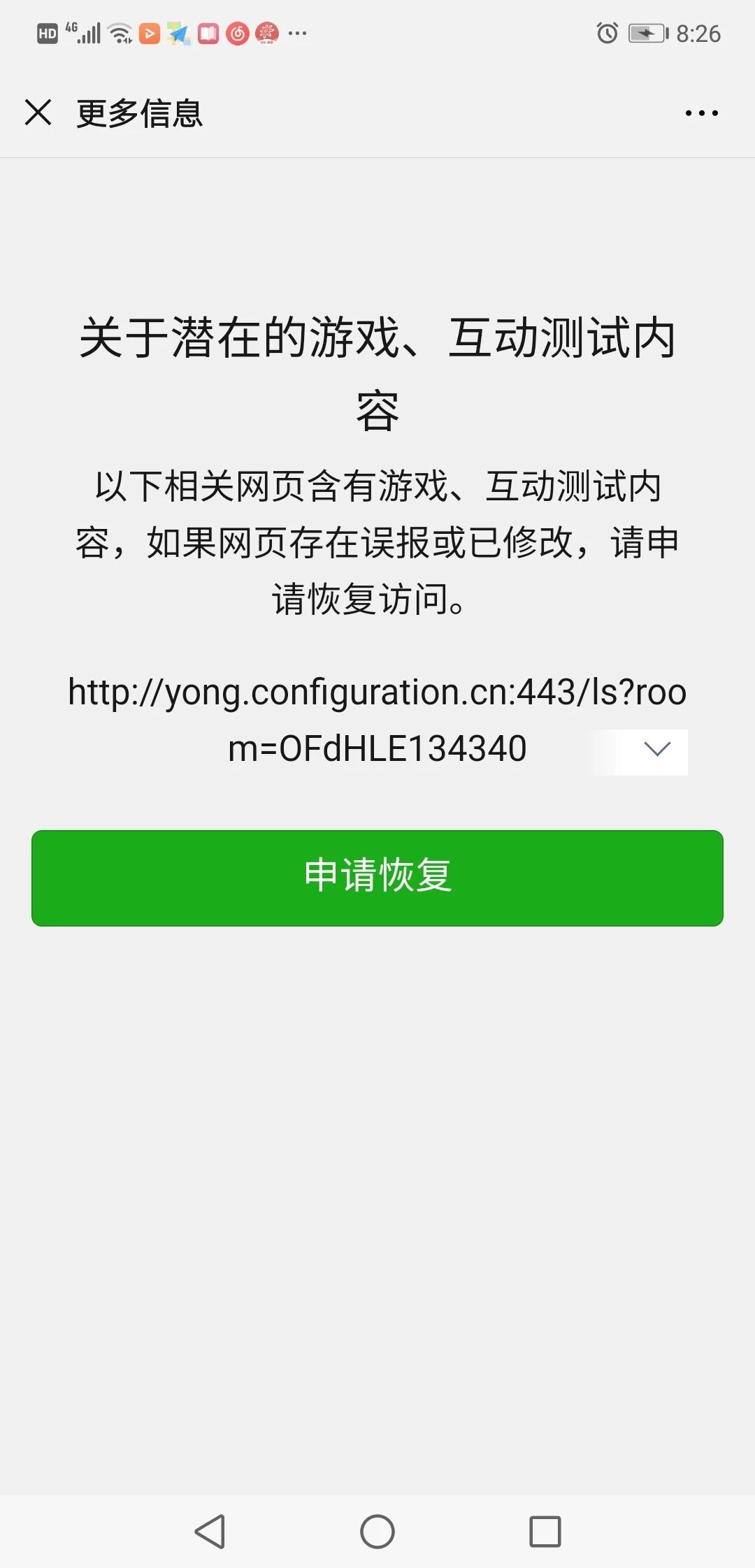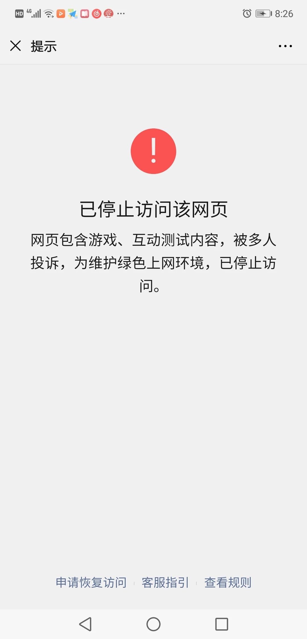 网页包含游戏、互动测试内容,被多人投诉,为绿色上网环境,已停止访问。在微信上申诉貌似不起作用。