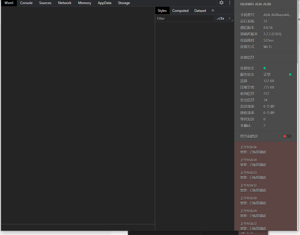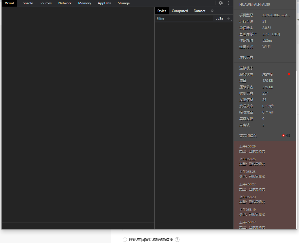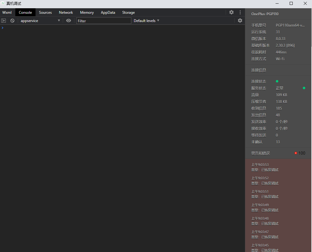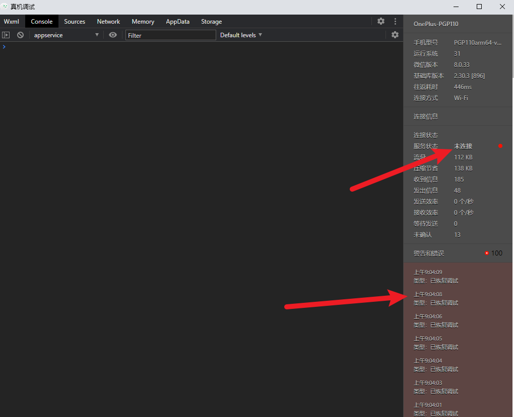 开发者工具真机调试连接的服务状态一直在“正常”和“未连接”之间跳。