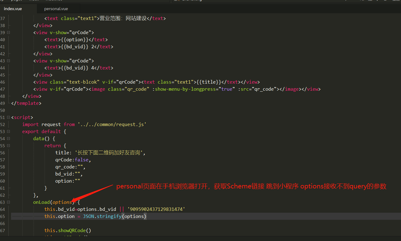 https://jumpapp.haidanet.com/index.html#/pages/personal/personal?bd_vid=4543534543 这是在线的链接跳到小程序后 获取不到query的参数