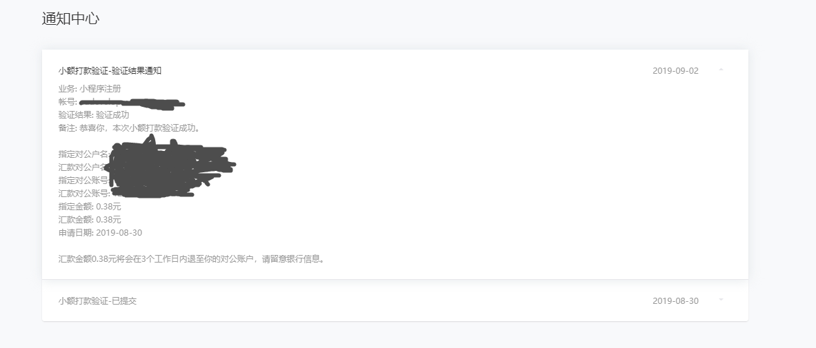 1、我注册了一个小程序账号,管理员绑定了我个人微信,并在2019.9.2已经完成了小额打款的企业认证