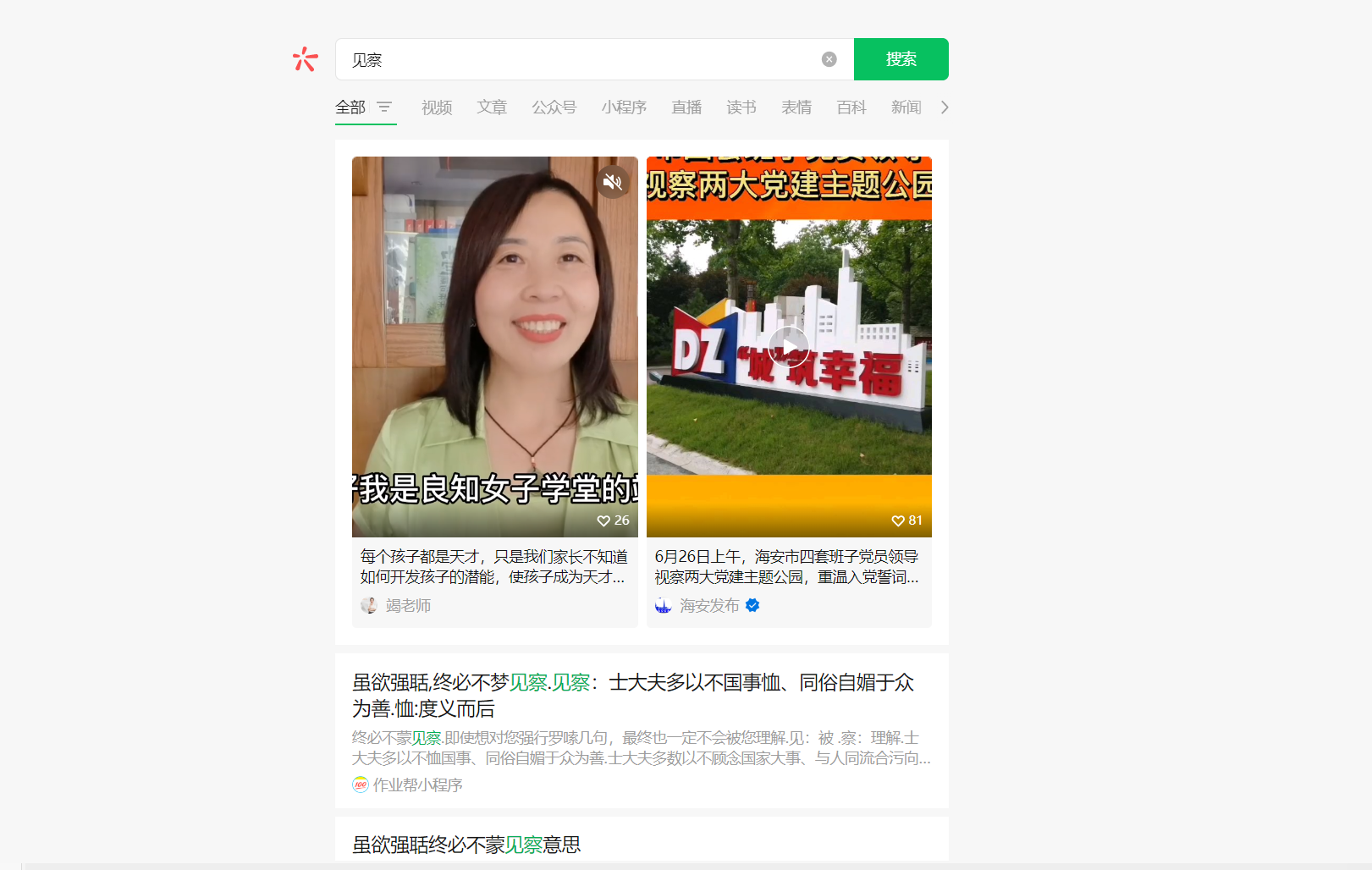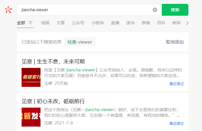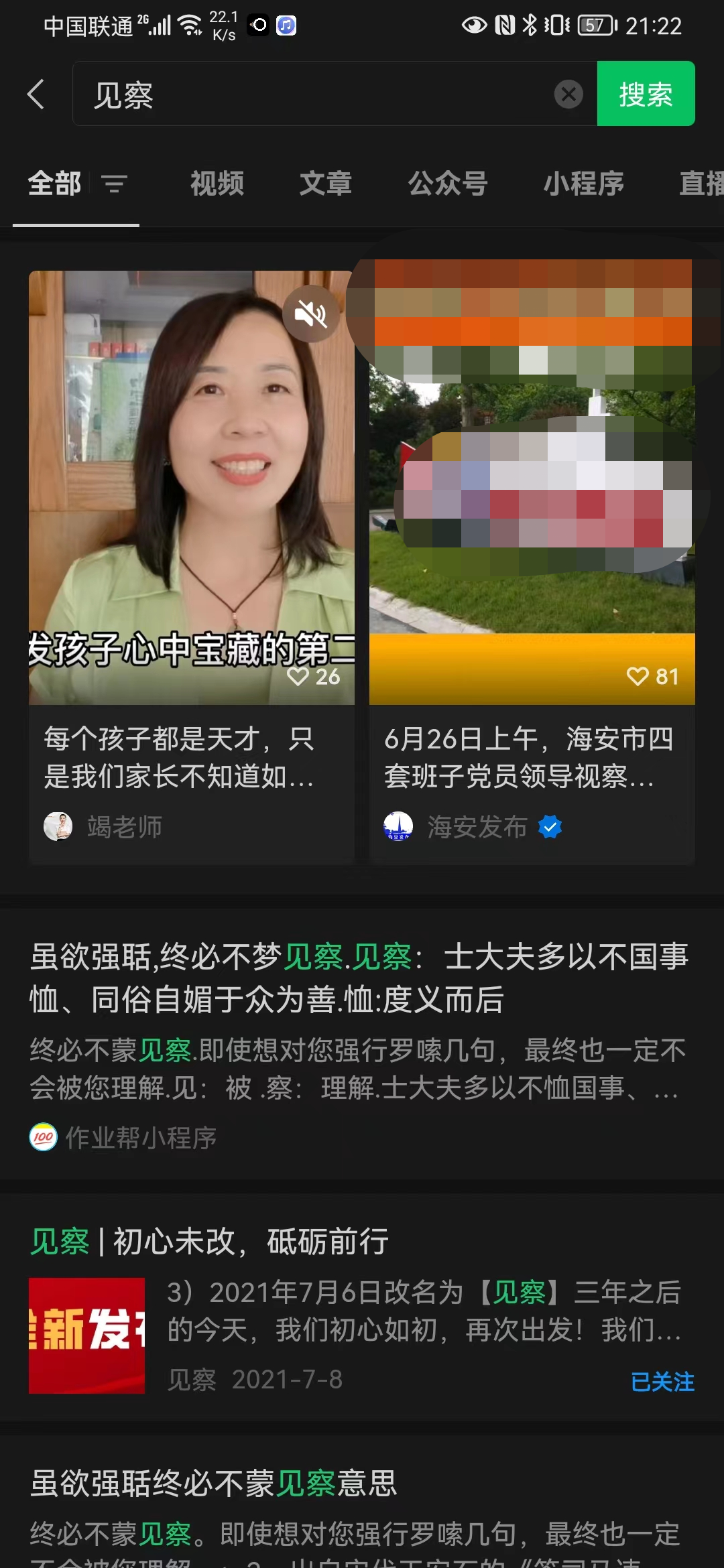 公众号:见察,已经注册四年,正常运营,非常奇怪,一夜之间突然无法通过账号名称进行搜索,在搜一搜入口中无法全部展示,如下截图,但是文章可被搜一搜展示,公众号没违规没有限制能力,正常发文,请求管理员处理解决!!!!【目前该号为大学本科毕业实践作品,9月底将进入展示环节】,希望尽快恢复搜索,否则影响我的大学毕业,我就毕业不了,拿不到学士学位,希望管理员能帮我!!!!!十万火急