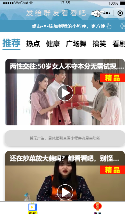 案例:如图可看到,该小程序存在视频广场模块内容,需补充:文娱-视频广场类目。