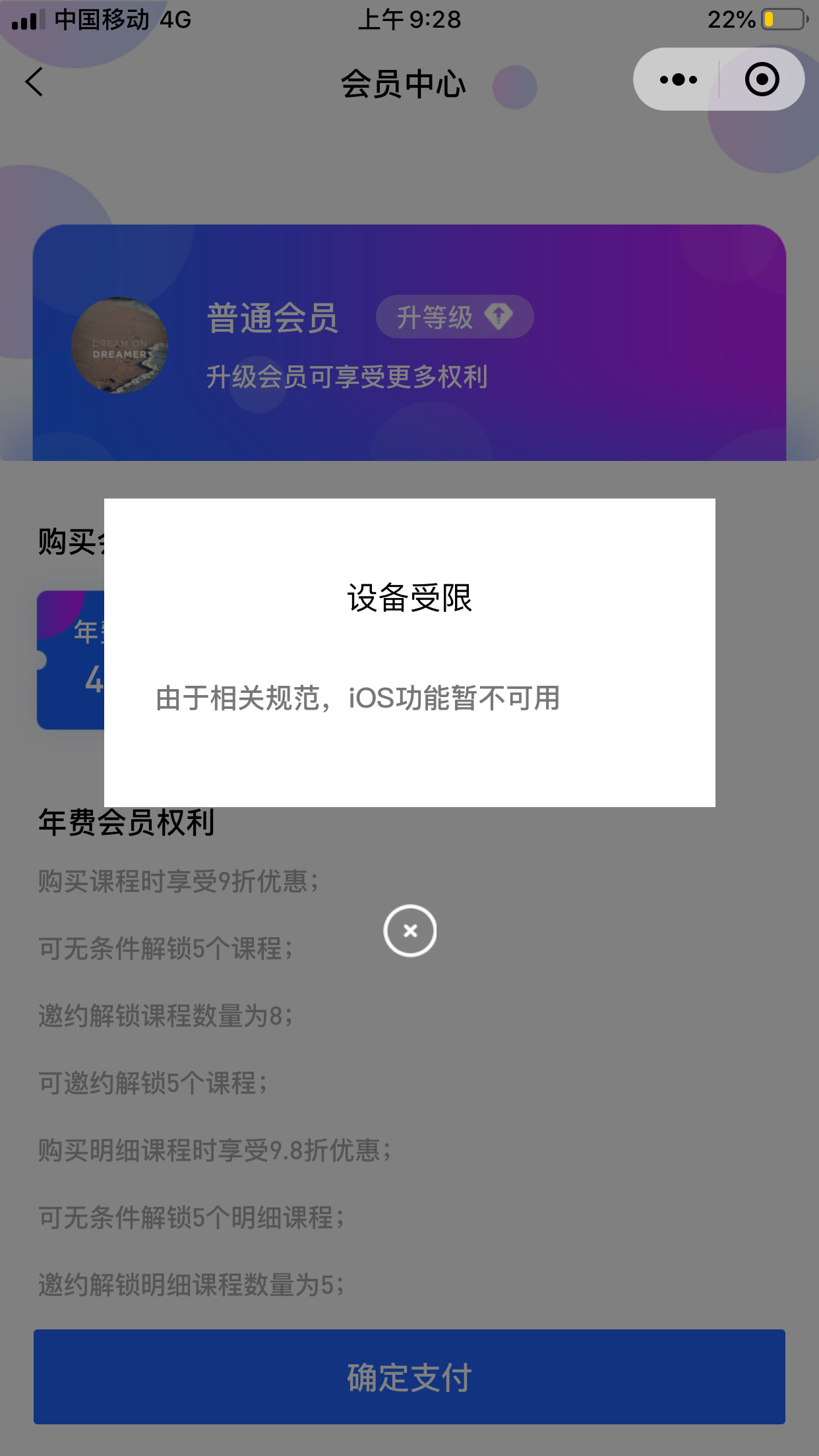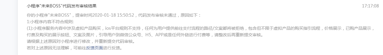 你好,经核实,你的小程序服务内容中仍涉及虚拟产品购买,ios平台规则不支持,任何为用户提供前往支付流程的路径/文案都将被拒绝,包含但不限于虚拟产品的购买指引流程,价格展示,已购产品展示,付费及购买的展示按钮、文案及图片,引导用户到微信公众号、H5、APP或是任何外链进行付费等,请整改后再重新提交审核。详情可参考运营规范5.13https://developers.weixin.qq.com/miniprogram/product/#_5-13-%E8%99%9A%E6%8B%9F%E6%94%AF%E4%BB%98%E8%A1%8C%E4%B8%BA(详图如下)