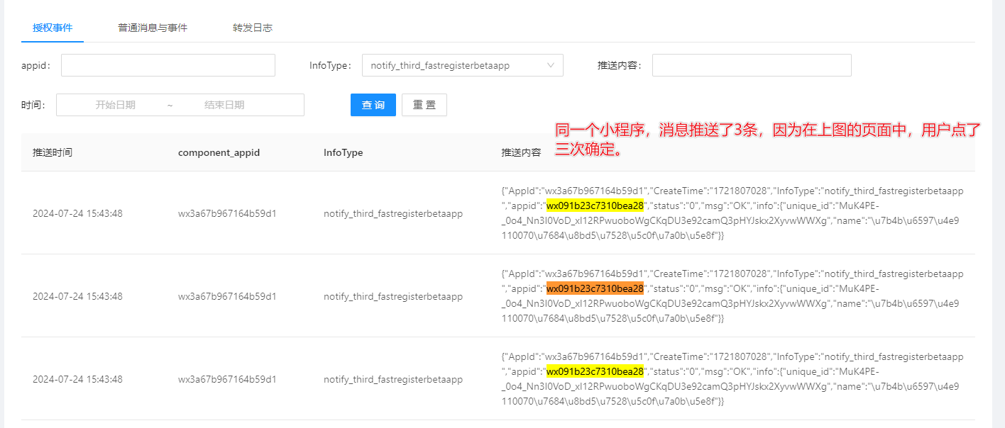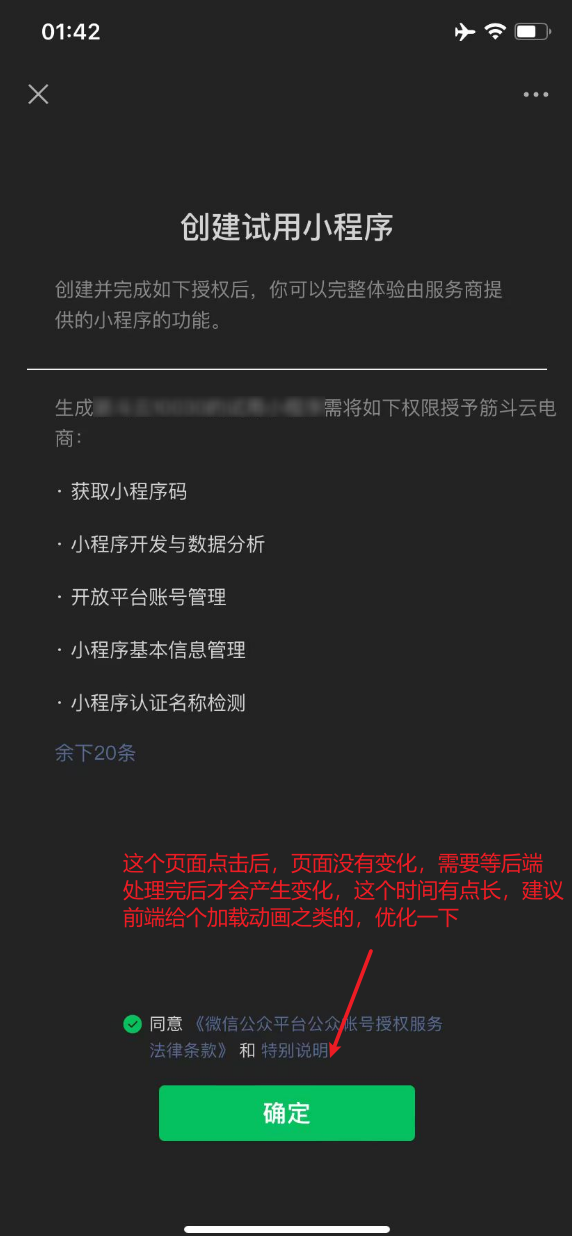 通过创建试用小程序功能,到这个页面的时候,点击确定后页面没有响应,估计是后台在异步处理请求,期间用户可能会重复点击确定按钮,导致会重复推送消息
