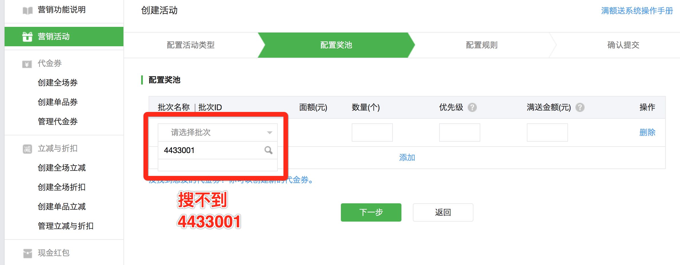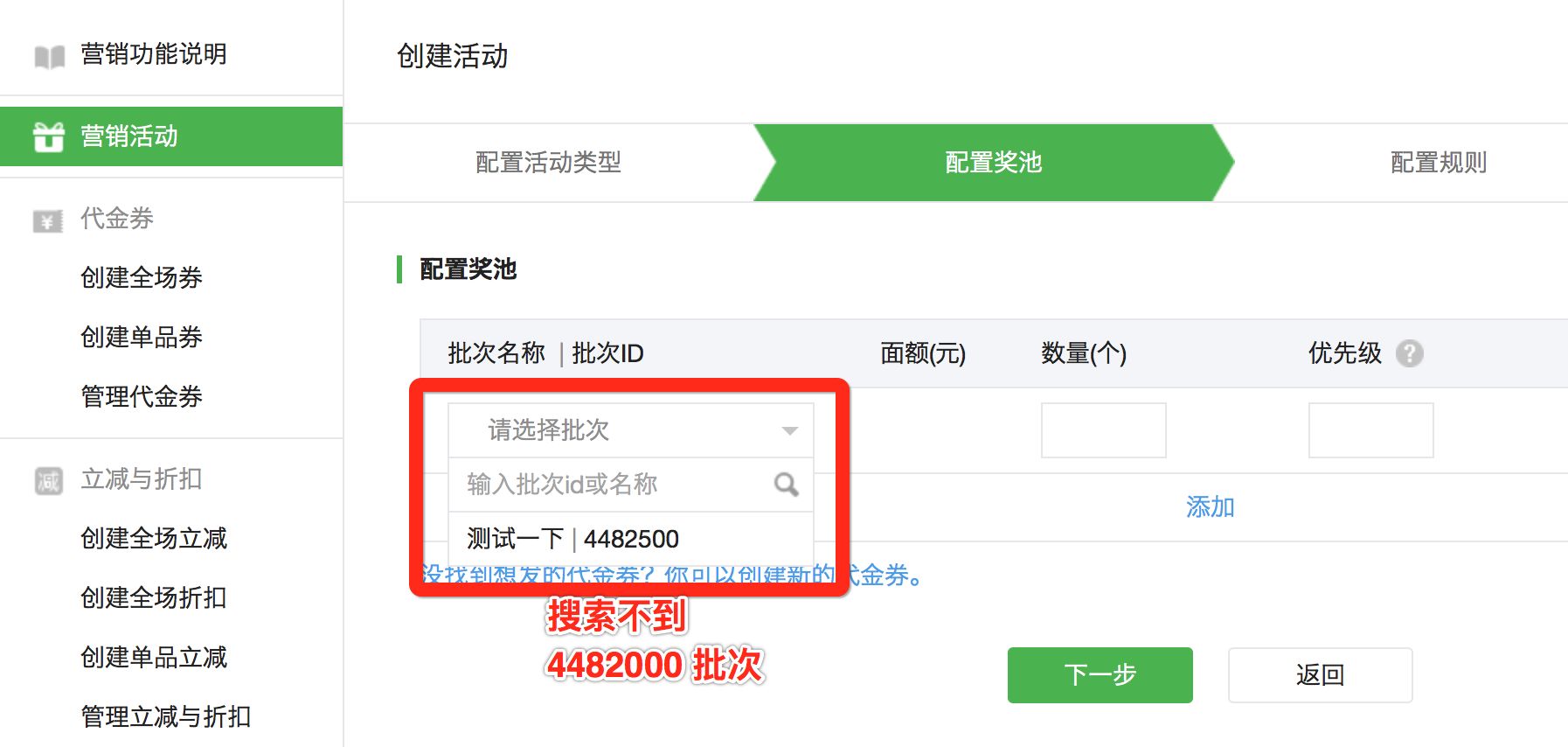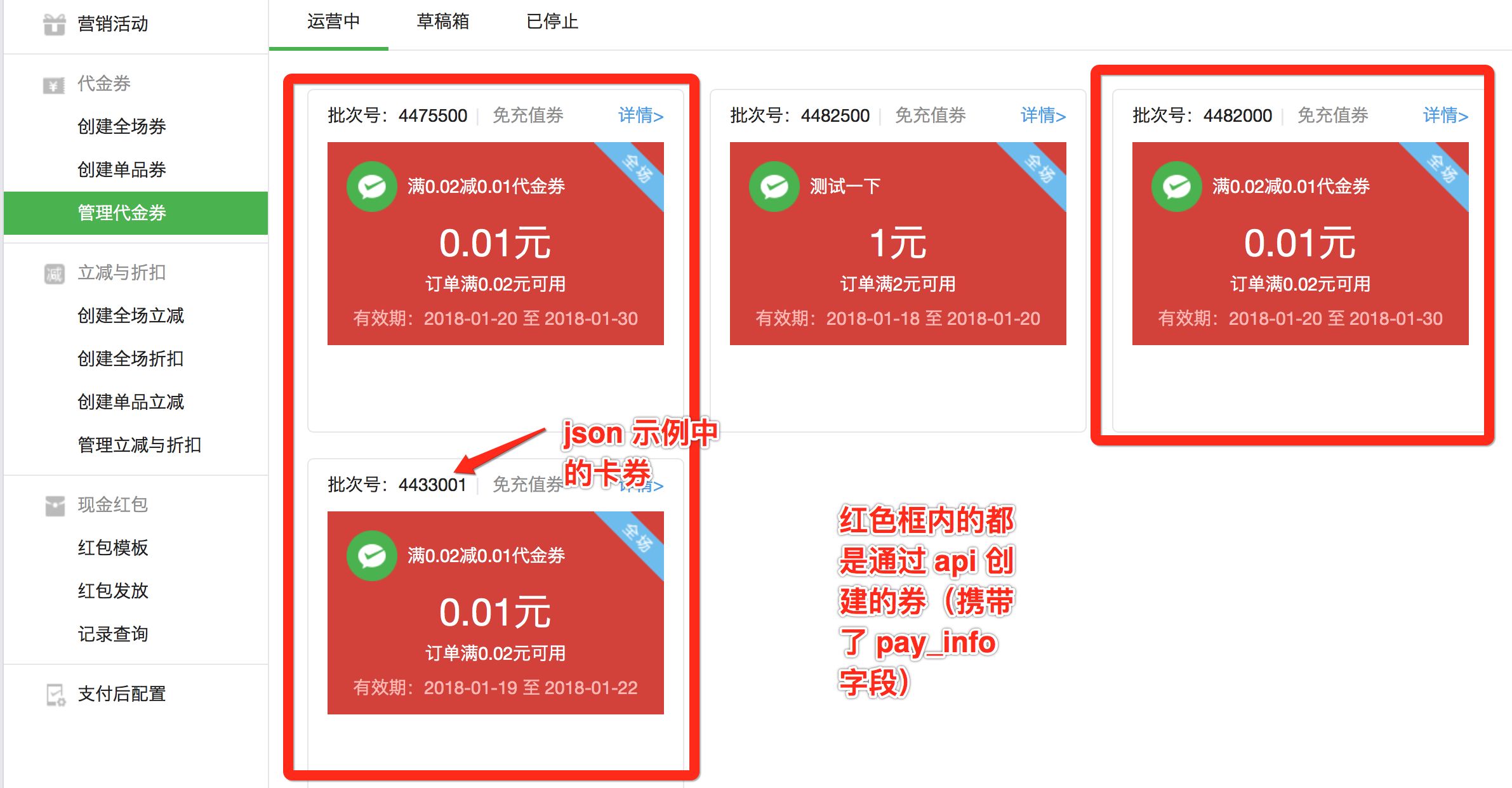 关于第2点:我们已按照文档2.3的要求设置了 pay_info 字段,也成功创建了与微信支付打通的券(如上面的截图,右侧的4482000批次的卡券即为api 创建的卡券),但这个卡券是无法在 pay.weixin.qq.com 的营销后台用于创建活动的,如下截图所示。是有意这样设计的吗?