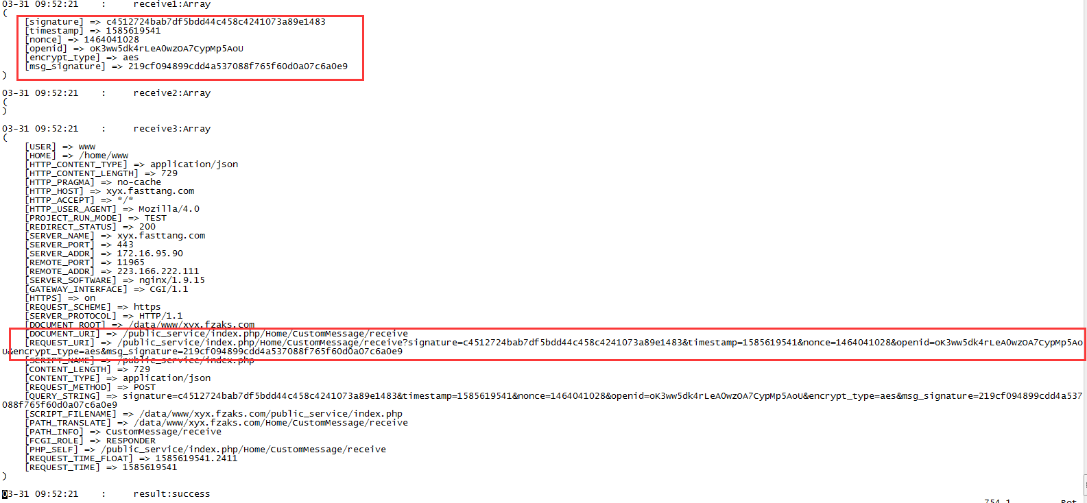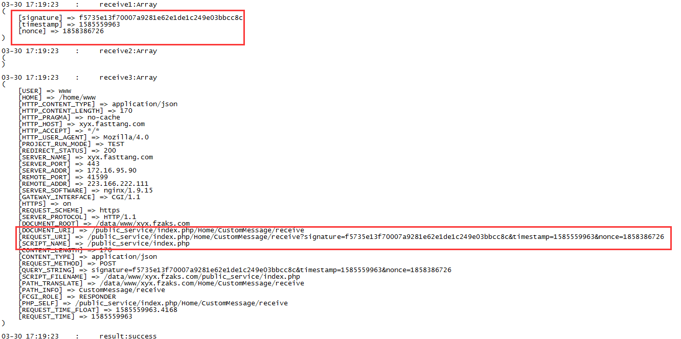 看我服务端打印出来的GET参数,只有signature、timestamp、nonce,并没有echostr参数