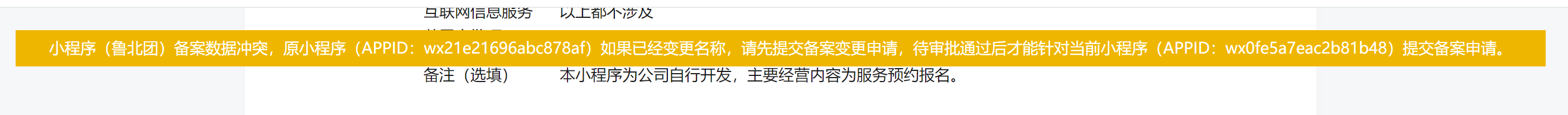 你好,小程序名称“鲁北团”已被小程序(appid:wx21e21696abc878af)备案占用,若想使用“鲁北团”作为小程序(appid::wx0fe5a7eac2b81b48)的小程序备案名称,请先变更/注销小程序(appid:wx21e21696abc878af)的备案。