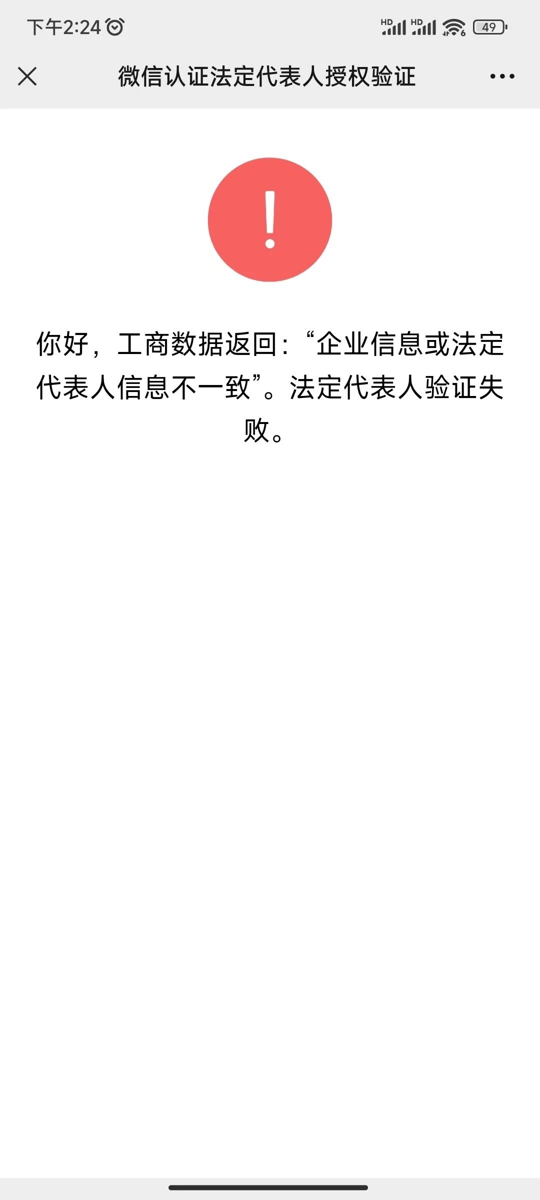 状态:工商数据返回:“企业信息或法定代表人信息不一致”。法定代表人验证失败。