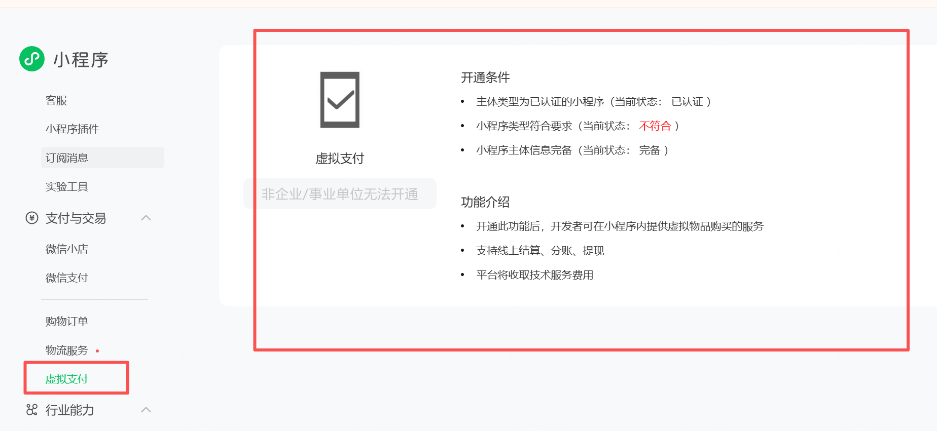 它提示我小程序类型不符合,但是我这个是企业的呀,个体工商户啊,都微信认证也做完了,小程序认证做完了。信支付的话也成功开启对接了,是为什么这里还不行呢?