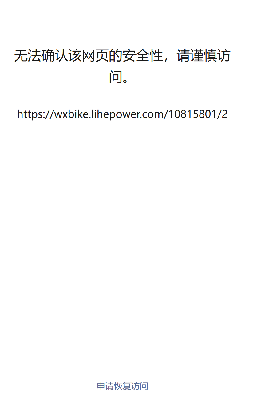 你好,经审核,域名【lihepower.com】下的链接【ev.lihepower.com/app-api/local/file】等内容存在违反《微信外部链接内容管理规范》的第6条“欺诈类内容”,请排查并把域名下相关违规内容修改并修复安全漏洞后进行申诉;申诉方式可点击停止访问页底部入口进行操作,我们会在三个工作日处理,请耐心等待。