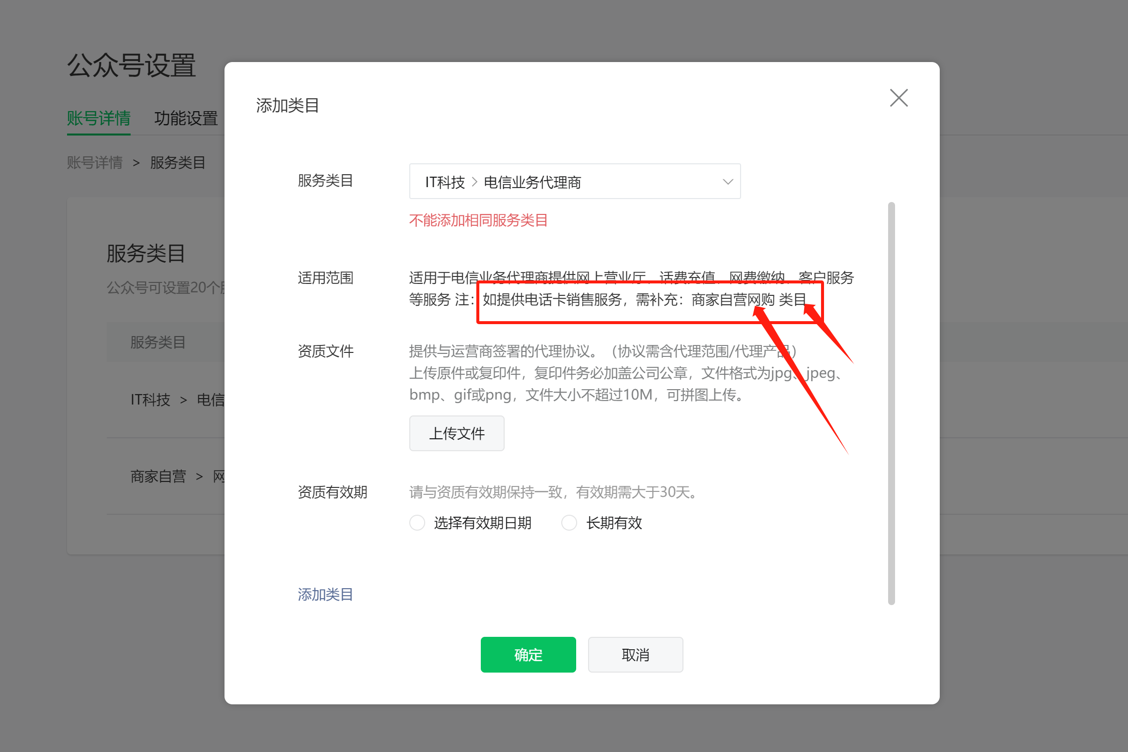公众号服务类目提交的时候,就已经提示,如要销售电话卡,需要补充网购类目。我这边之前都已经早就上传和补充过网购类目的了。请查看上图。