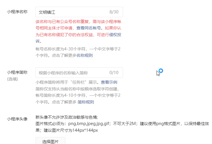 申请的小程序,与微信公众号同主体,但是在给小程序起名时,提示“该名称与已有公众号名称重复,需与该小程序帐号相同主体才可申请,查看同名帐号。如果你认为已有名称侵犯了你的合法权益,可进行侵权投诉。”