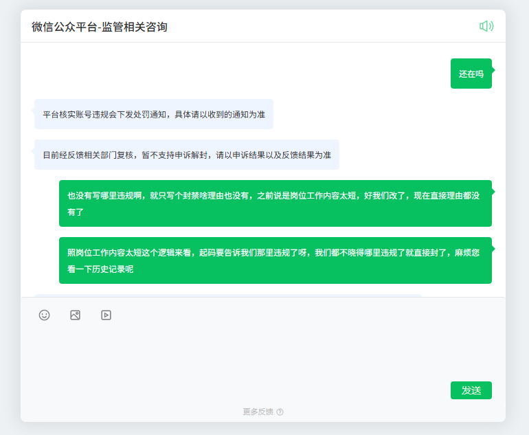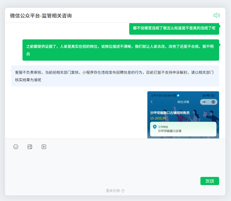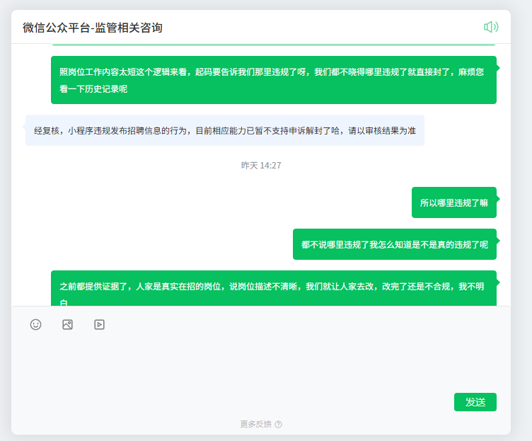 我们做的兼职小程序被封,按照提示整改之后去申诉还是没过,也没有不过的理由,去问客服客服说工作内容太短了,不能只写“店内导购”,然后我们又通知商家把岗位工作内容改了,改了之后重新提交还是不过,再去找客服客服说已经反馈,一到两个工作日内再来咨询,第二天去问直接就是根据相关部门审核,申诉不通过,什么原因都没有,一直就这一句话,该怎么办哇,要给人整绝户了。
