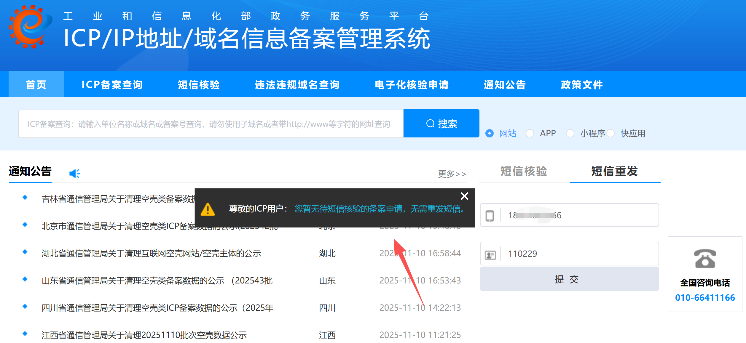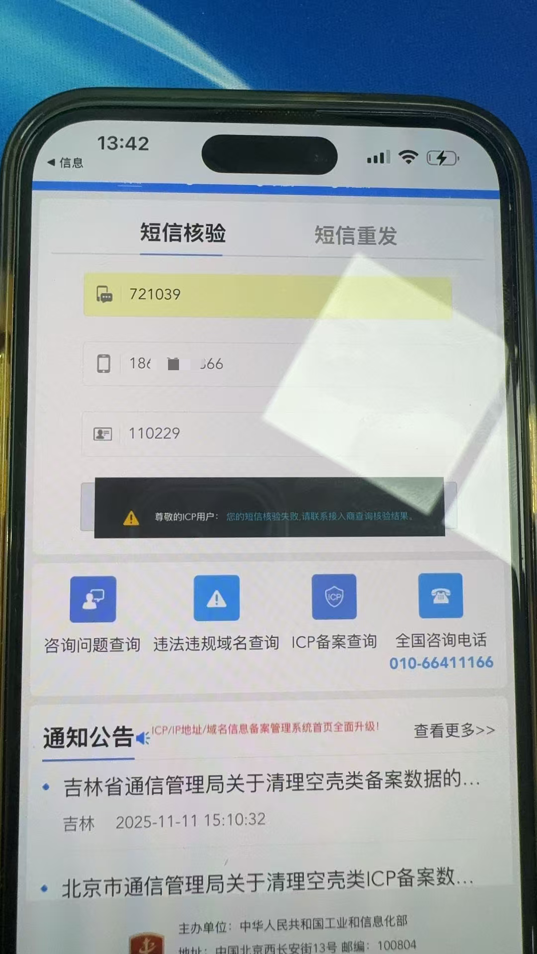 小程序备案时,小程序负责人输入验证码和身份证后六位提示 “您的短信核验失败,请联系接入商查询核验结果”,我的信息并没有填写错误,这是什么原因?
