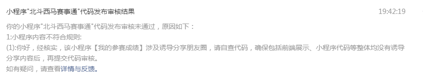 你好,经核实,贵方小程序最新提审版本【我的参赛成绩】仍涉及平台未允许的内容:诱导分享朋友圈,请自查代码,确保包括前端展示、小程序代码等整体均没有分享朋友圈内容后,再提交代码审核。
