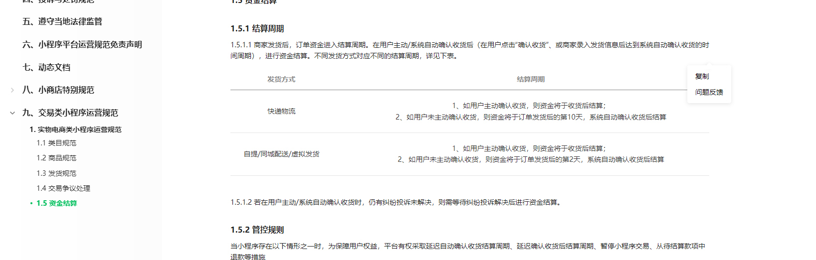 你好,请参考文档:https://developers.weixin.qq.com/miniprogram/product/jiaoyilei/yunyingguifan.html#_1-5-%E8%B5%84%E9%87%91%E7%BB%93%E7%AE%97