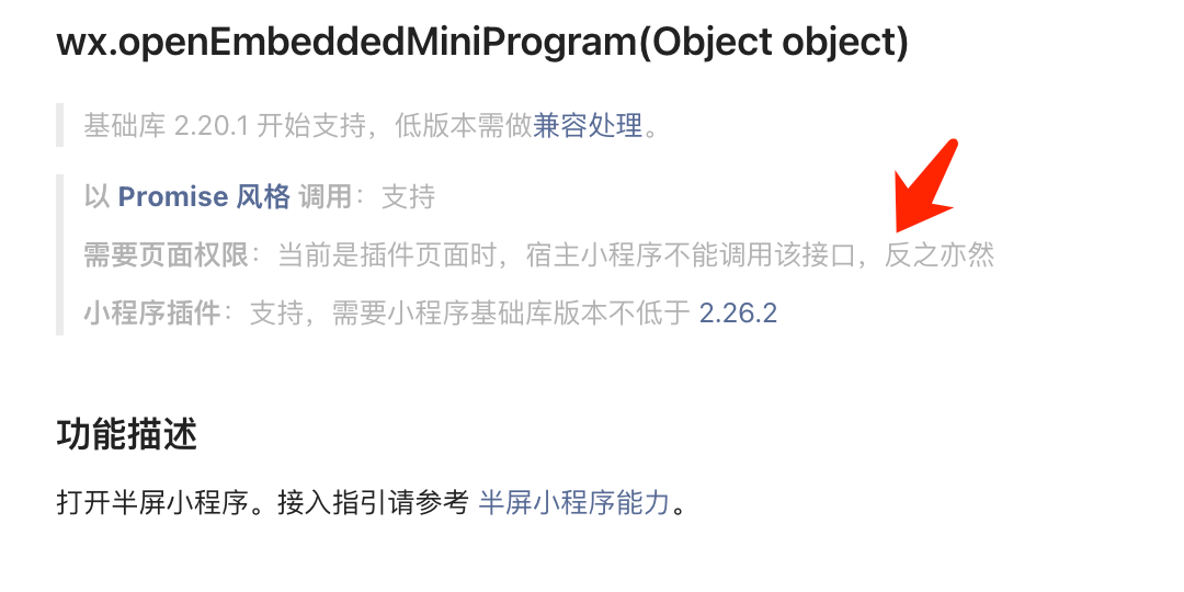 插件是小程序下面建的插件,因此插件appid使用和小程序appid一致,在小程序中调用拉起半屏可以正常拉起但是在插件中调用拉起半屏报错 errMsg: "openEmbeddedMiniProgram:fail rejected due to no permission currently in plugin"