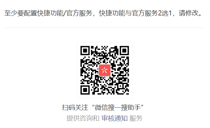 微信搜一搜提示账号符合官方区准入门槛,但接入时提示:需要配置快捷功能 / 官方服务,2选1可以接入。
