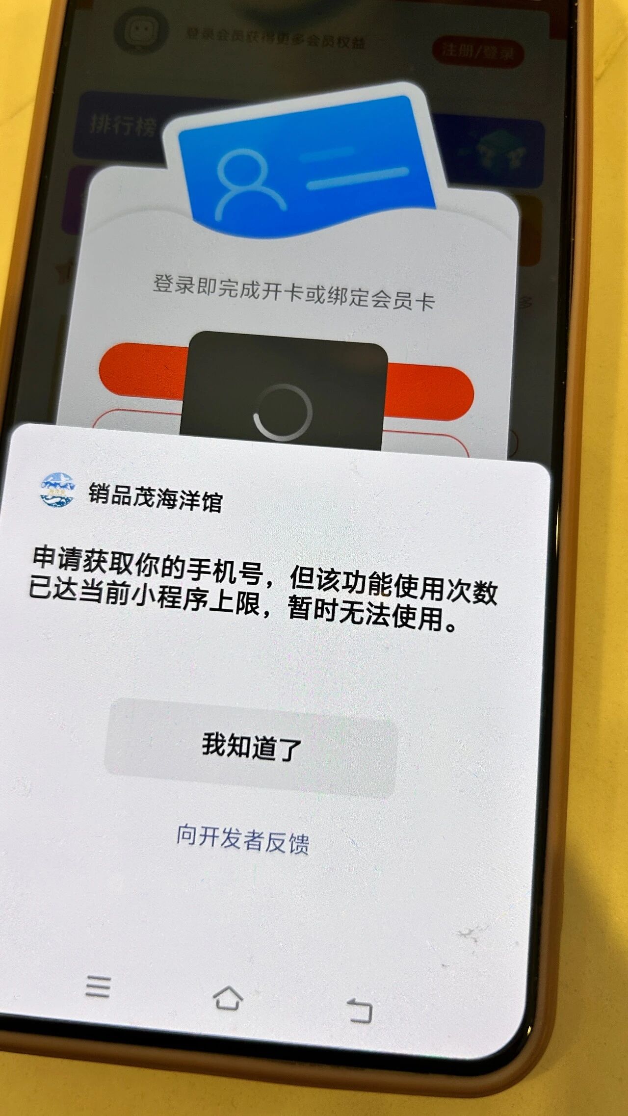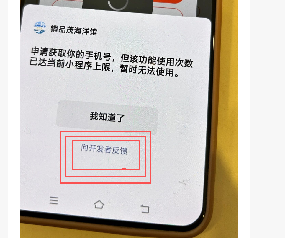 用手机号注册小程序会员,但是注册失败,有一个消息显示:申请获取您的手机号,但该功能使用次数抵达当前小程序上限,暂时无法使用。这个问题该怎么解决?