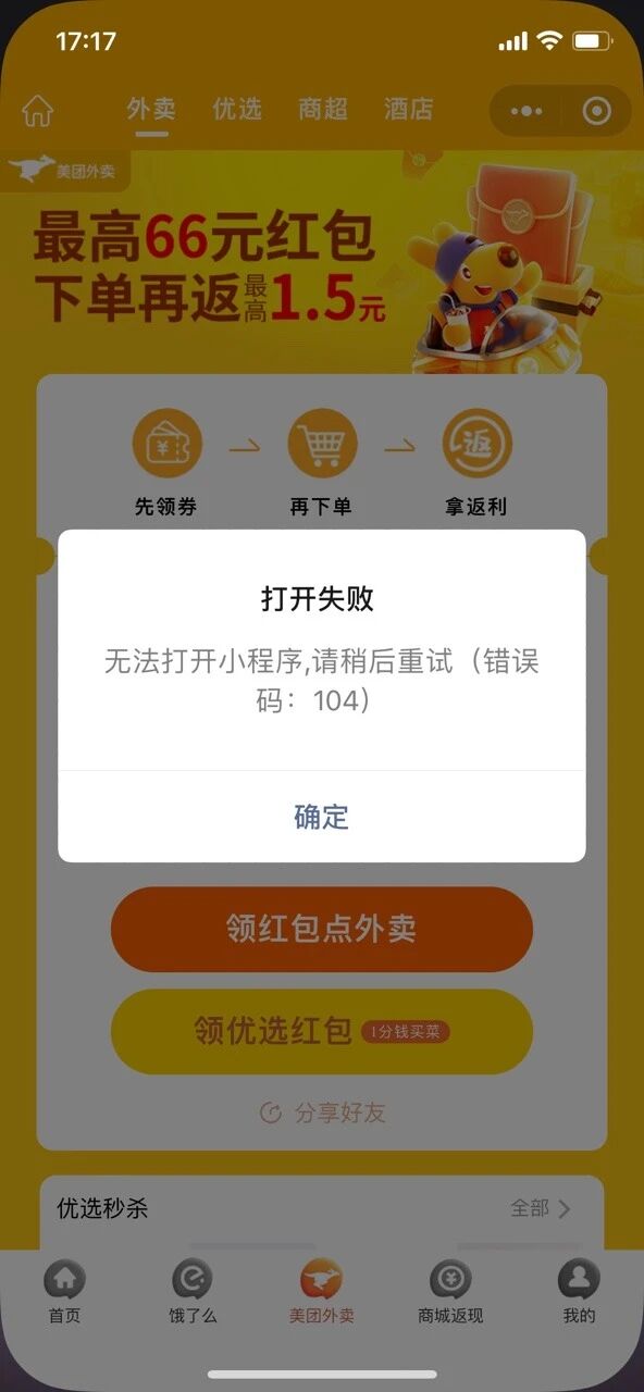 小程序【阿甘小镇】,进入tabbar【美团外卖】,点击【领红包点外卖】,打开【美团团购】小程序报错。