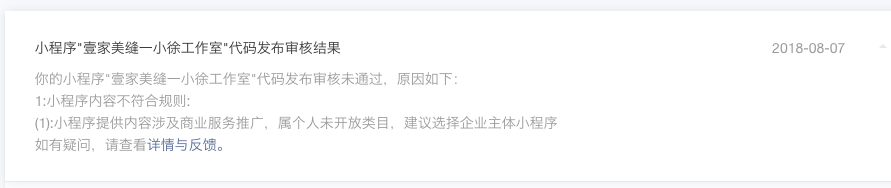你好,经核实,你方小程序提供内容为壹家美缝一小徐工作室 的业务宣传,属于商业服务-公关/推广/市场调查类目范畴,而个人主体未开放该类目,建议选择企业主体小程序,并选择商业服务-公关/推广/市场调查类目。