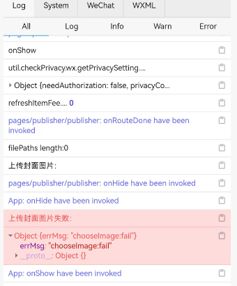 在手机调试小程序内所有页面调用wx.chooseImage({}),没反应,真机调试报错errMsg: "chooseImage:fail"。电脑上是可用的。没有问题。