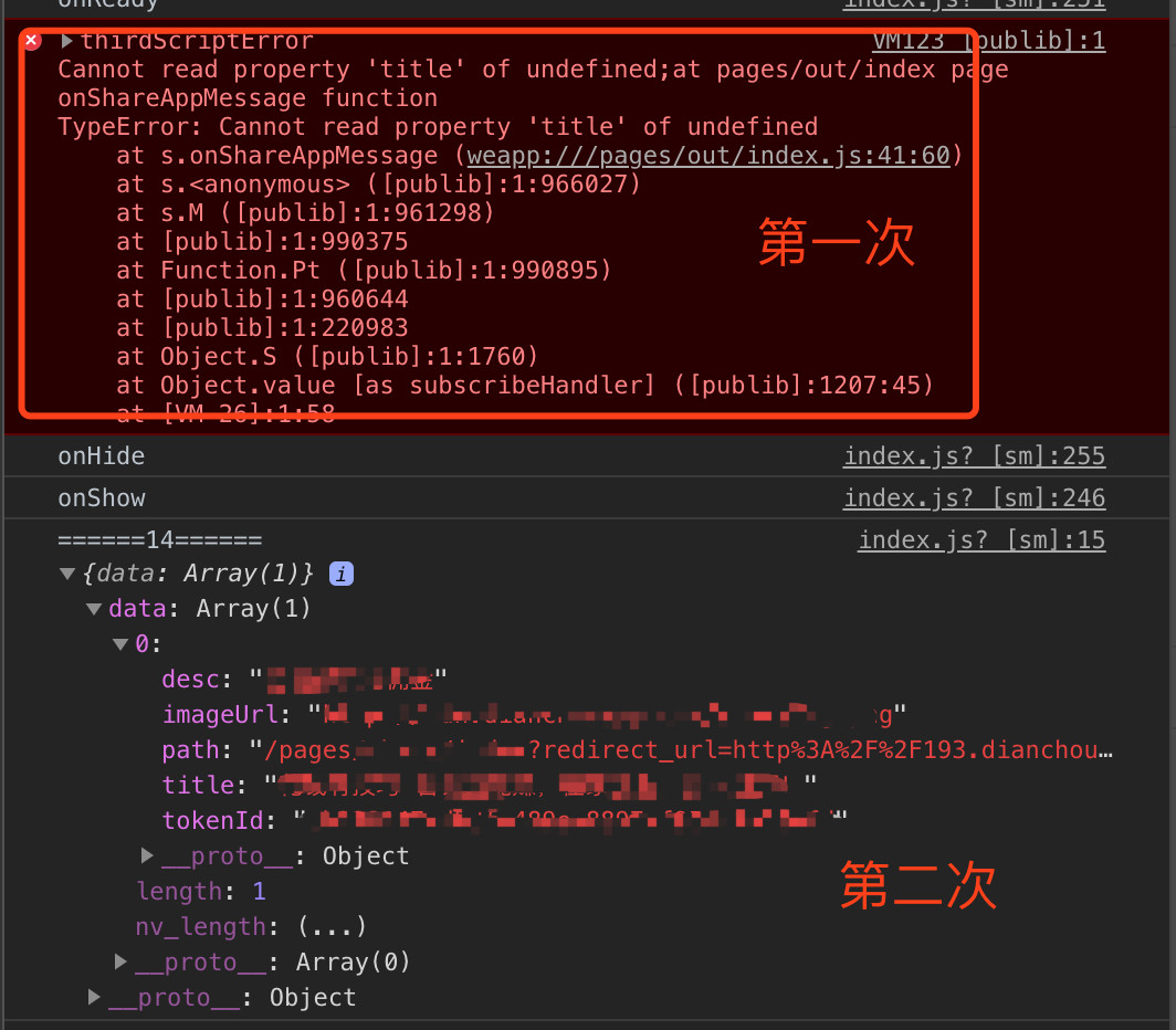 然后经过测试发现,安卓手机第一次触发会报错,但是重新进入页面再分享的话就可以拿到数据,这是什么问题,请问怎么解决