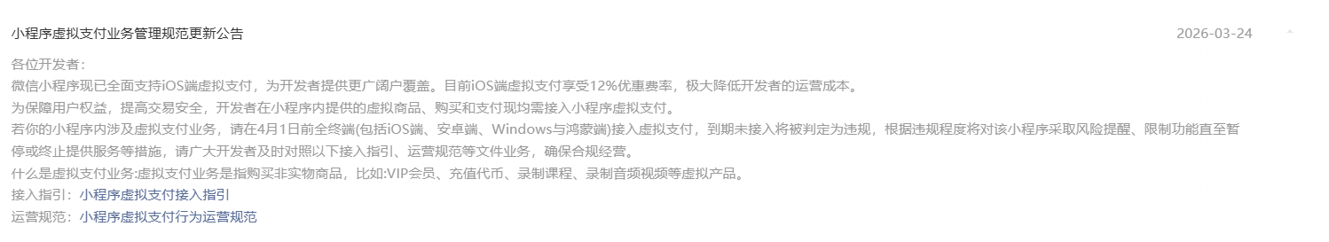 收到小程序站内虚拟支付业务通知,我司主要做物联网卡设备,微信智能手表,智能摄像头,主要通过小程序提供设备流量充值,业务不涉及(虚拟代币、解锁功能、订阅内容、付费功能、打赏、购买虚拟礼物会员),请问是否需要对接虚拟支付