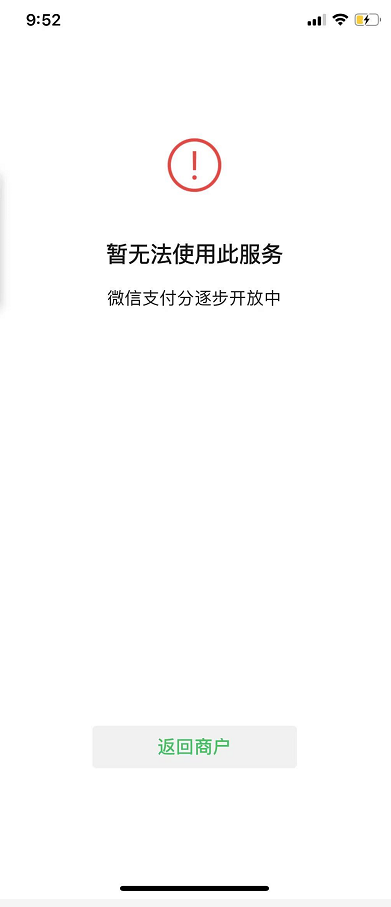 4,Q:商户app、小程序、公众号跳转支付分小程序(授权页、确认订单页、订单详情页)报错“暂无法使用此服务,微信支付分逐步开放中”?