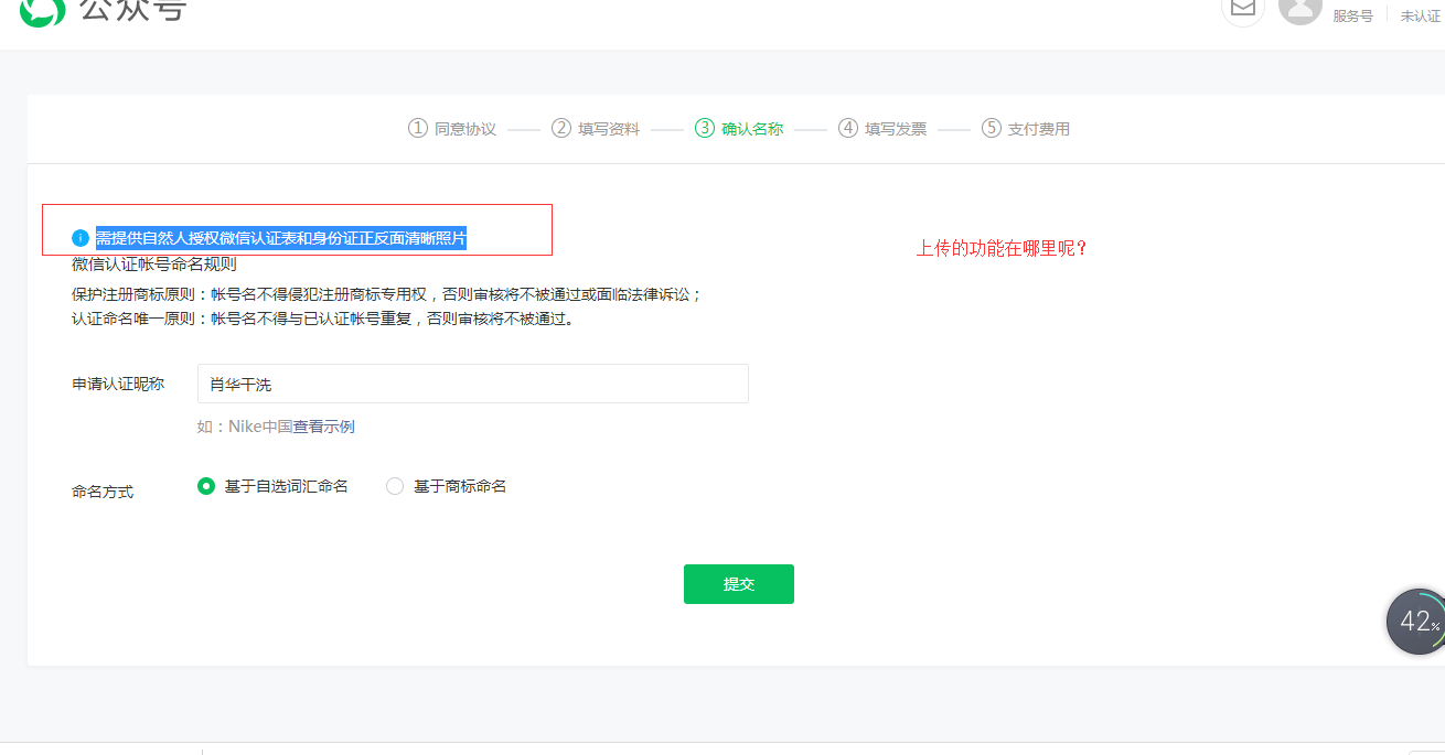 微信服务号认证打电话让长传身份证照片,但是只能重填,重填页面只有提示文字,没有上传功能,这个该去哪里上传身份证照片了