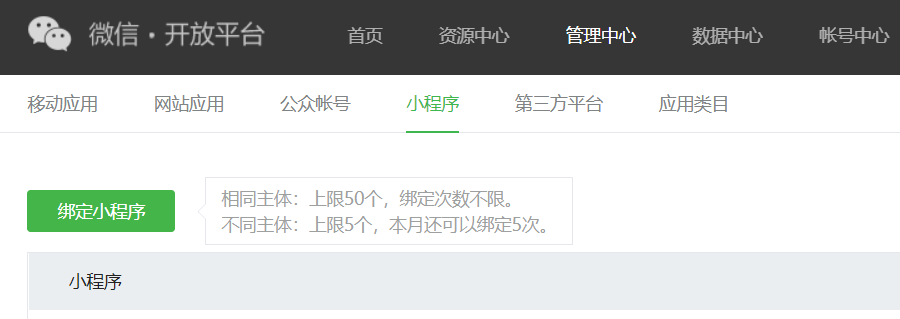 A与B,A与C分别在开放平台中成功进行了主体关联,并且在各自开放平台中都关联了小程序,B与C也分别绑定了对应主体的企业微信。(下图是C主体截图)