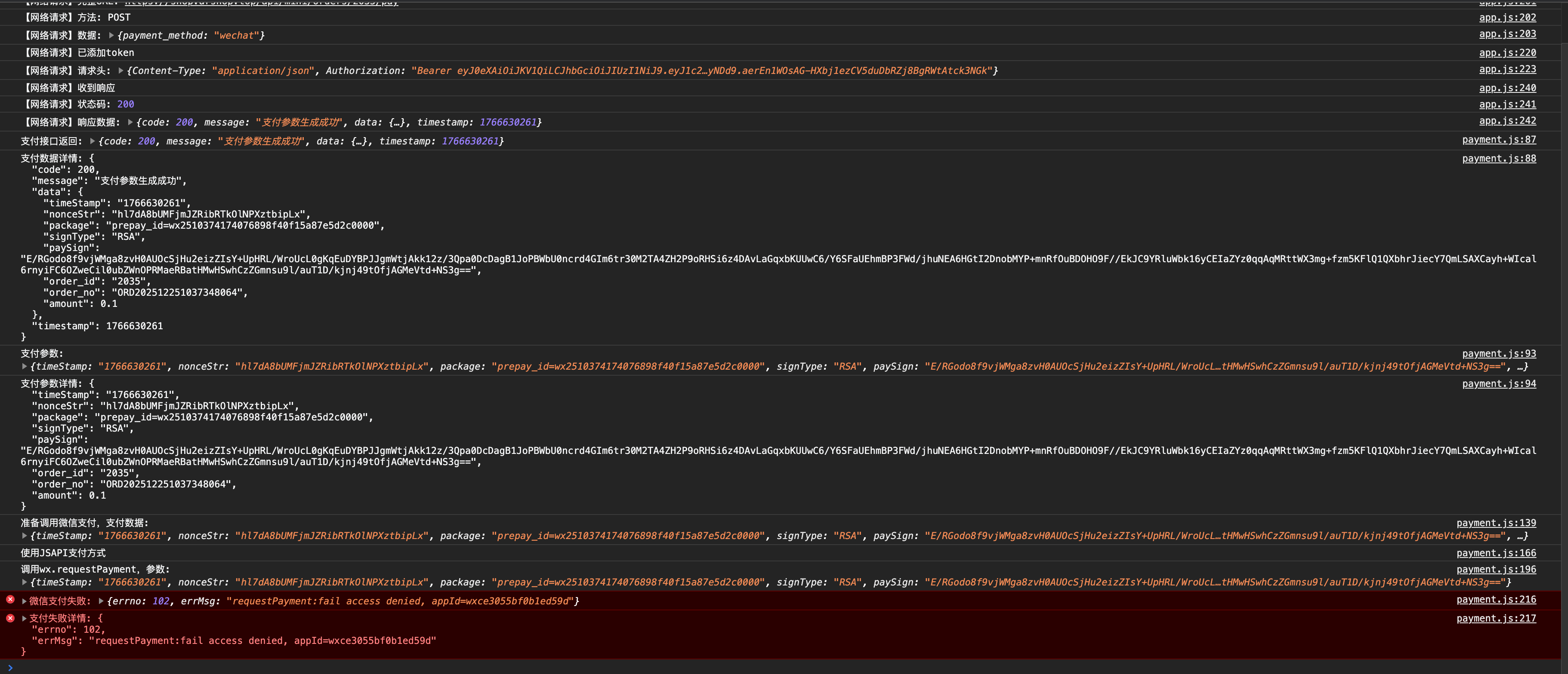 errMsg: "requestPayment:fail access denied, appId=wxce3055bf0b1ed59d"
