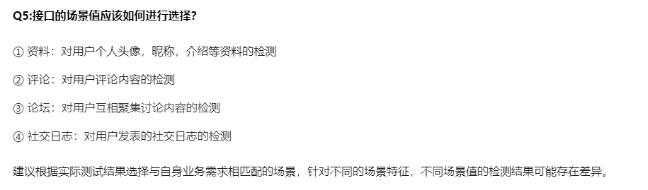 你好,建议优先接入与业务相符合的场景,若无相符合场景可选择,可根据实际测试结果选择与自身业务需求相匹配的场景,针对不同的场景特征,不同场景值的检测结果可能存在差异。若判别结果有疑议,我们会进一步核实。