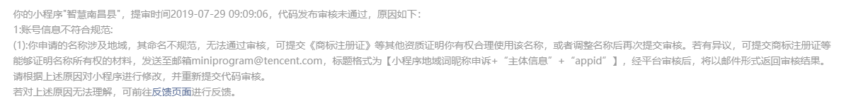 目前小程序 “智慧南昌县” 这个名称在小程序命名规则变更后无法通过审核;提示需要提供商标注册证或其他证明资质