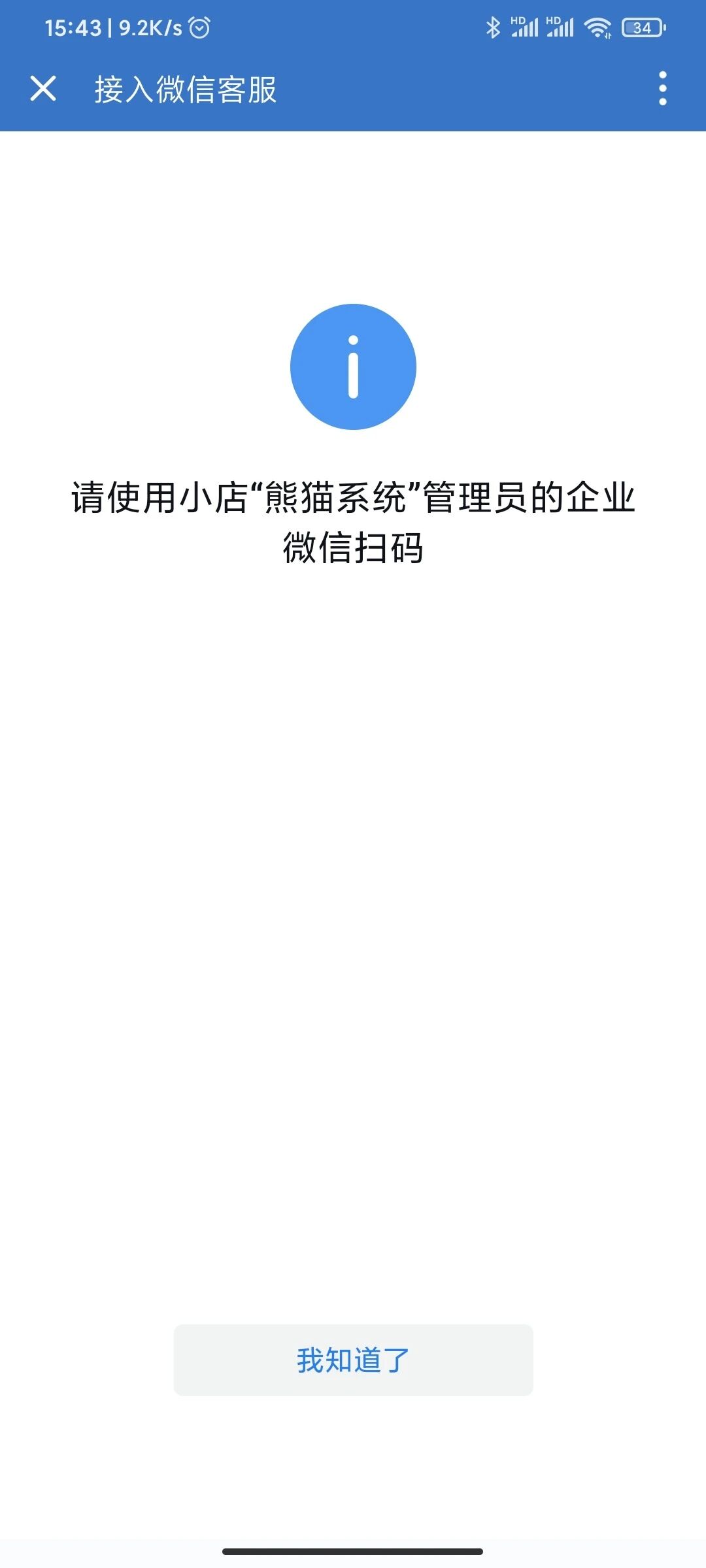 要用你开店的那个微信扫,并且扫码的设备上需要有你那个账号登陆的企业微信